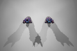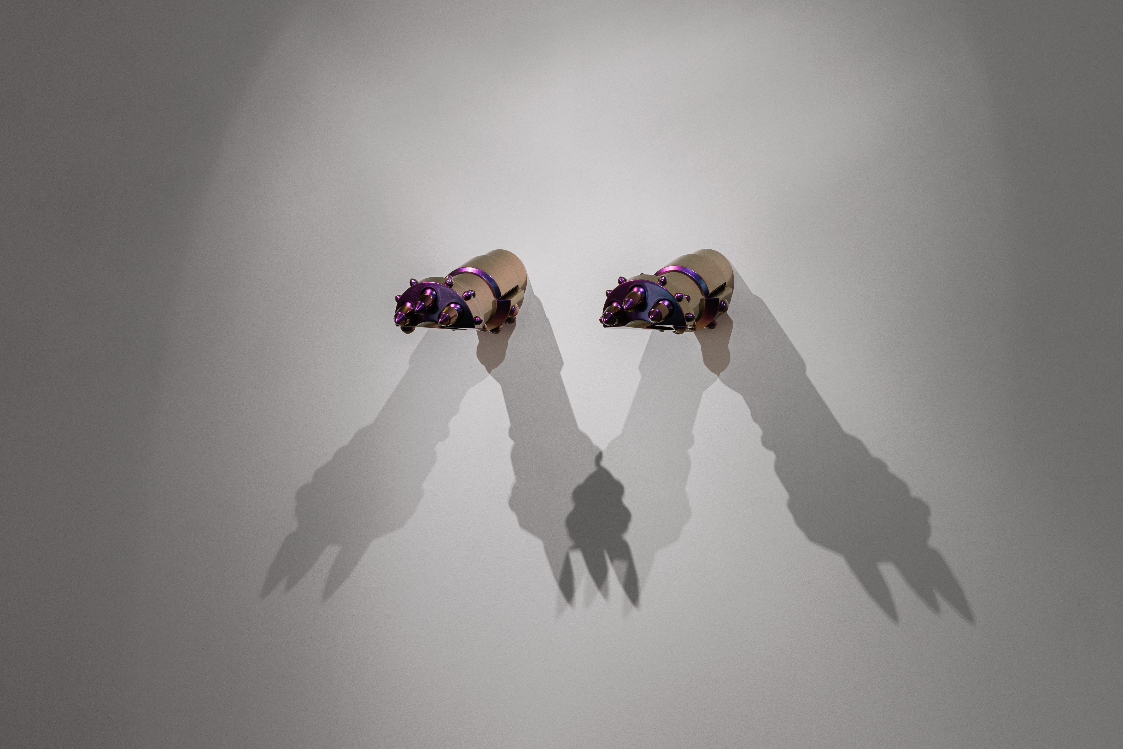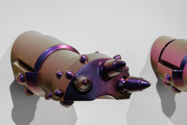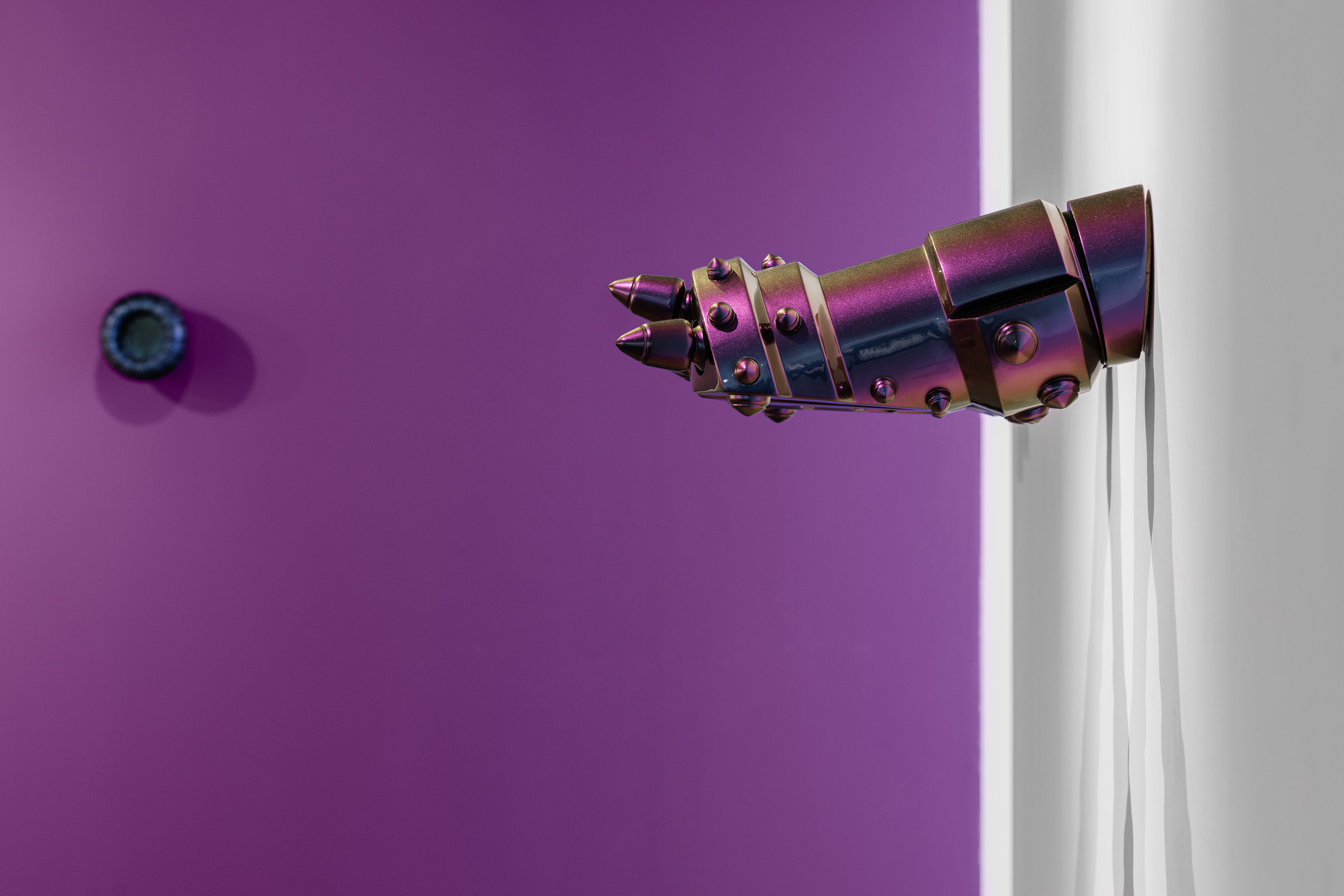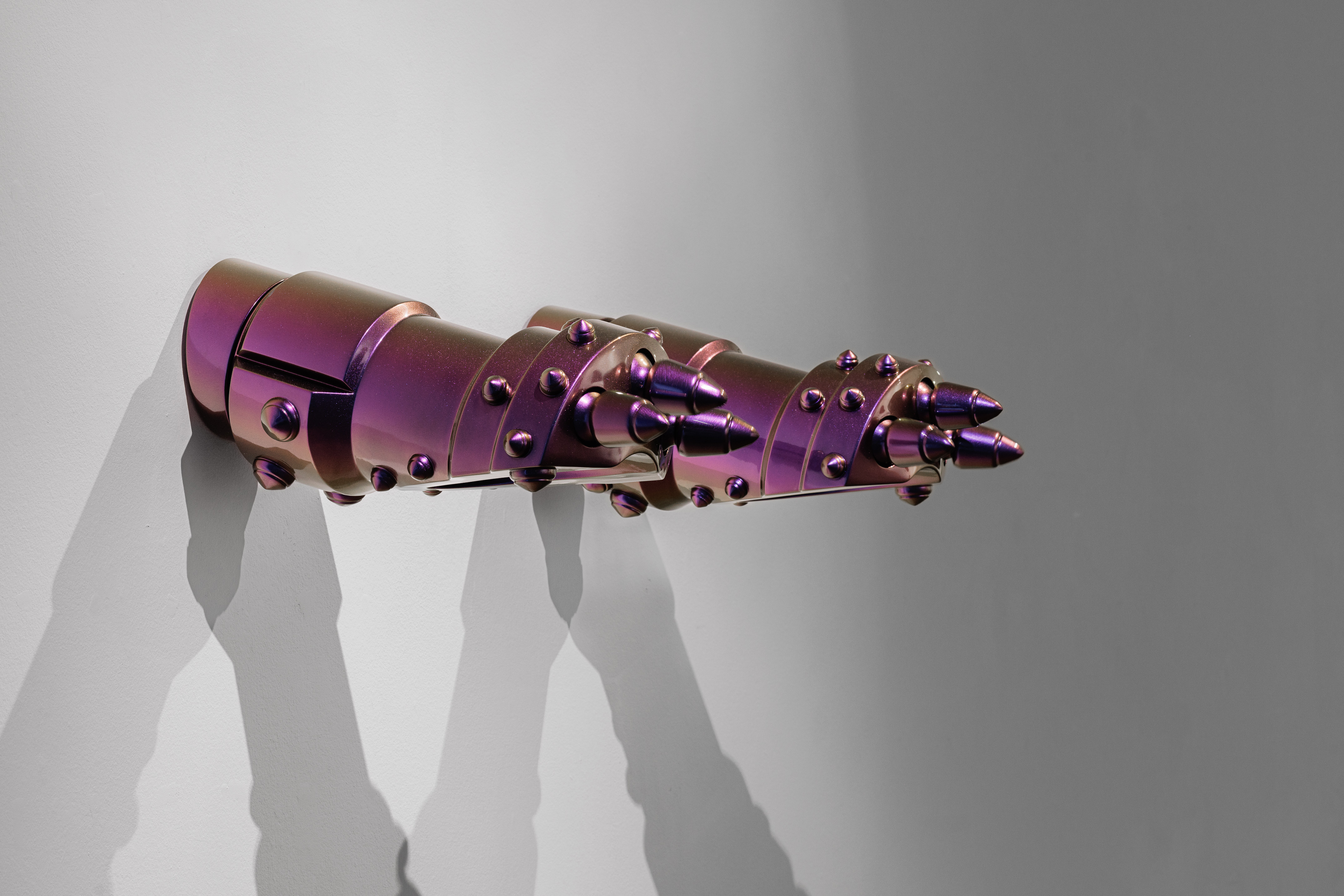 This work is comprised of two fantastical oil drill bits that resemble “claws” or “talons” emerging from the wall. Their “fingers” move, creating an organic or animalistic feel to objects that are otherwise akin to machines. This humorous work, which can be also related to the dinosaur in the nearby work Seismic Songs, also acts as a play on a “gauntlet” drill bit, which resembles a hand or glove with three fingers. The work’s bright purple hue—a common motif in Al Qadiri’s practice—makes the objects look even more unnatural, even alien, in their design and purpose while also recalling the reflective sheen of oil or a pearl’s surface. This speaks to the constant paradox present throughout the artist’s works—something can be seen as appealing, alluring, or otherworldly but also be dangerous and destructive.