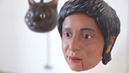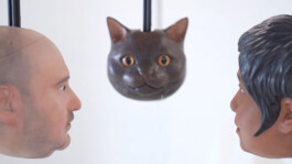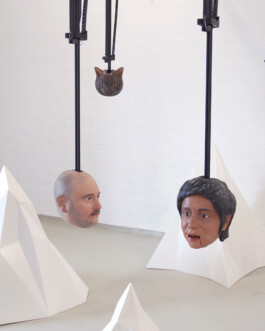 Suspended Delirium is a collaborative project by Monira Al Qadiri and Raed Yassin that traverses the space between performance, installation and robotics, resulting in an uncanny and unclassifiable work. Three floating robotic heads hanging from the ceiling - based on the two artists and their pet cat - converse in an absurd manner about dreams, conspiracies, urban memories and life in the digital age among other subjects. Accompanied with a musical soundtrack and a stage set laid out on the ground, the work attempts to highlight the difficulties experienced through migration, isolation and destruction. The artists aim to pose timely questions about life under crisis (the pandemic), as well as the feelings of madness they must overcome by being totally uprooted from their past and their home.